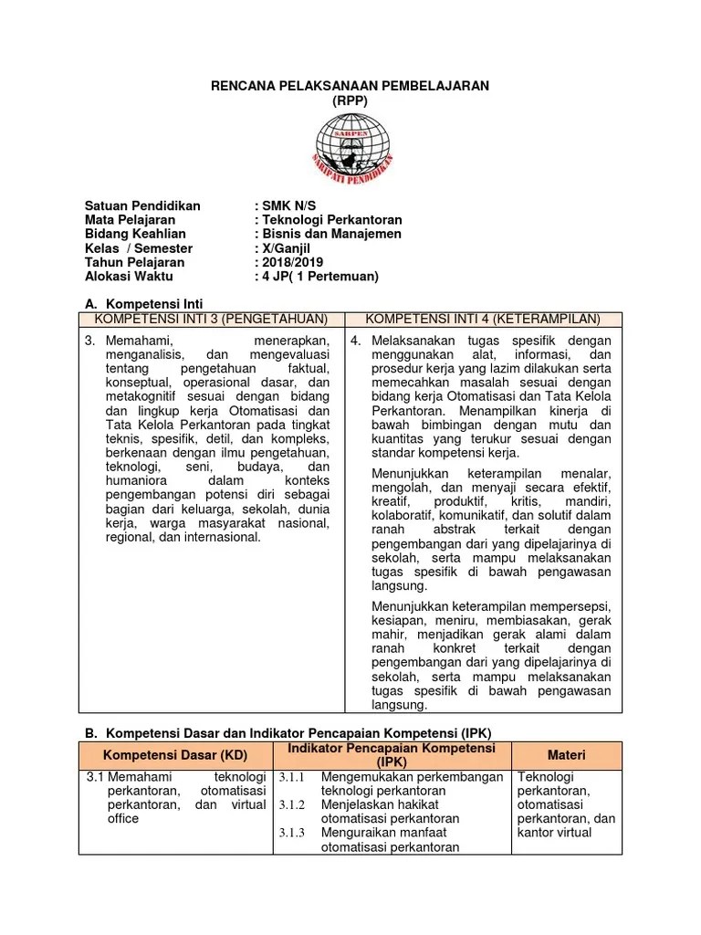 Teknologi perkantoran bidang keahlian : Modul otomatisasi perkantoran 1 smk kurikulum 2013. Kompetensi inti, kompetensi dasar, indikator pencapaian kompetensi, materi ajar itulah artikel mengenai file rpp daring smk/mak kelas 10. Baca juga perangkat pembelajaran teknologi perkantoran kelas x jurusan otkp. Persiapan untuk meraih nilai terbaik.